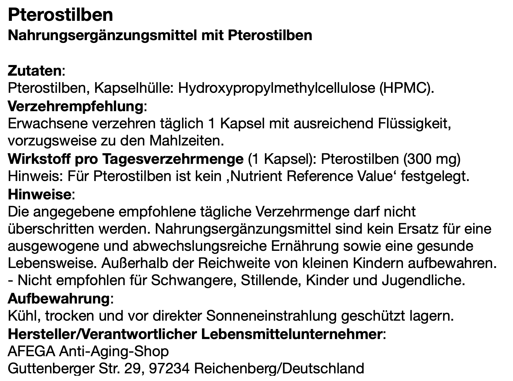 Pterostilbene ist (im Vergleich zu Resveratrol oder gar zu NMN) sehr schwer und so passen in die kleinste Kapsel, die es auf dem Markt gibt, 300 mg. Wir empfehlen aus diesem Grund, dass Sie das reine Pulver kaufen, wenn es Ihnen wichtig ist, die empfohlene Tagesdosis nicht zu überschreiten. Bitte beachten Sie aber: Wir liefern, wenn Sie reines Pulver erwerben, keinen Messlöffel dazu!