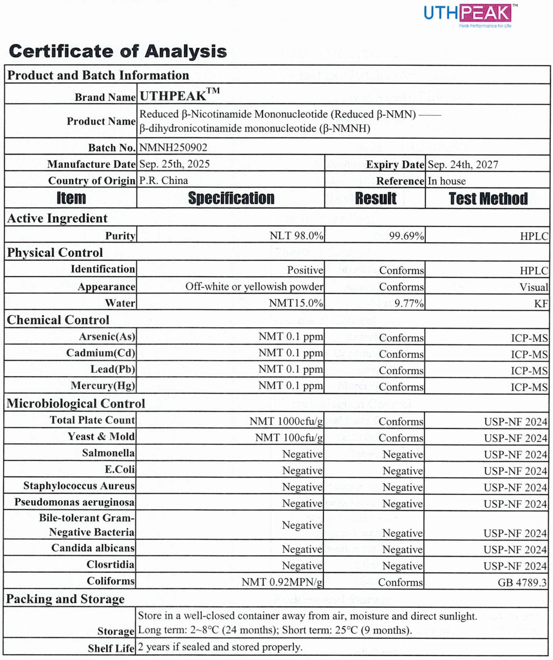 O NMNH é fornecido em cápsulas embaladas individualmente hermeticamente. O NMNH é estável à temperatura ambiente por pelo menos 5 meses, mas ainda deve ser armazenado na geladeira por precaução.
